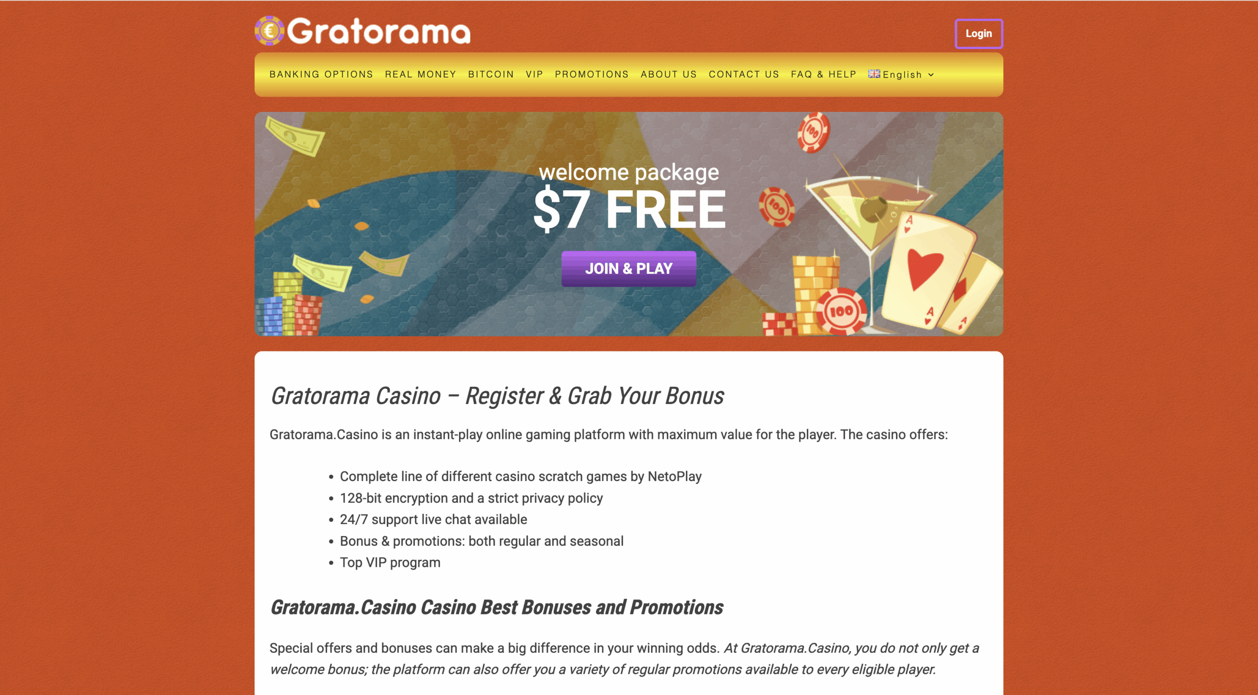 Gratorama Casino pôsobí ako staršie, jednoduché online kasíno so zameraním na stieracie žreby a základné sloty, ktoré môže zaujať nenáročných hráčov hľadajúcich rýchlu a nenútenú