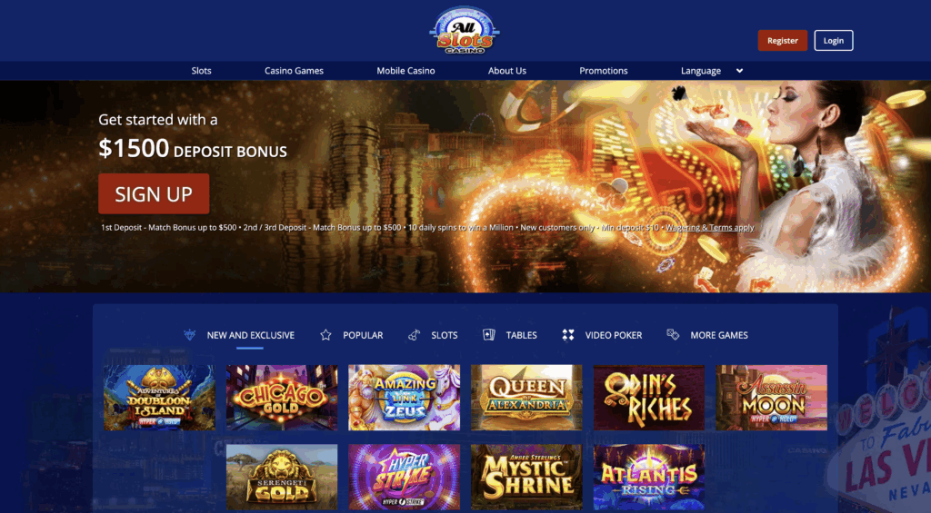 Webová stránka All Slots Casino pôsobí profesionálne a prehľadne, pričom jej hlavný cieľ je okamžite motivovať hráča k registrácii prostredníctvom výrazného uvítacieho bonusu až do 1 500 €. Úvodná sekcia s veľkým bannerom, modernou grafikou a jasným „Sign Up“ tlačidlom vytvára dojem dôveryhodného kasína s dlhoročnou históriou. Hneď pod ním sa nachádza prehľad hlavných kategórií hier – nové, populárne, sloty, stolové hry a video poker, čo umožňuje hráčom rýchlu orientáciu.