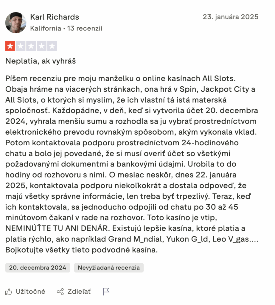 Na základe analyzovaných recenzií má All Slots Casino rozporuplnú povesť medzi hráčmi. Viacerí používatelia sa sťažujú na pomalé alebo neúspešné výbery výhier, problémy s verifikáciou účtov a neochotnú zákaznícku podporu. Objavujú sa aj tvrdenia o podozrivých praktikách či neaktuálnych promo kódoch, čo naznačuje určité slabiny v komunikácii a správe zákazníckych procesov.