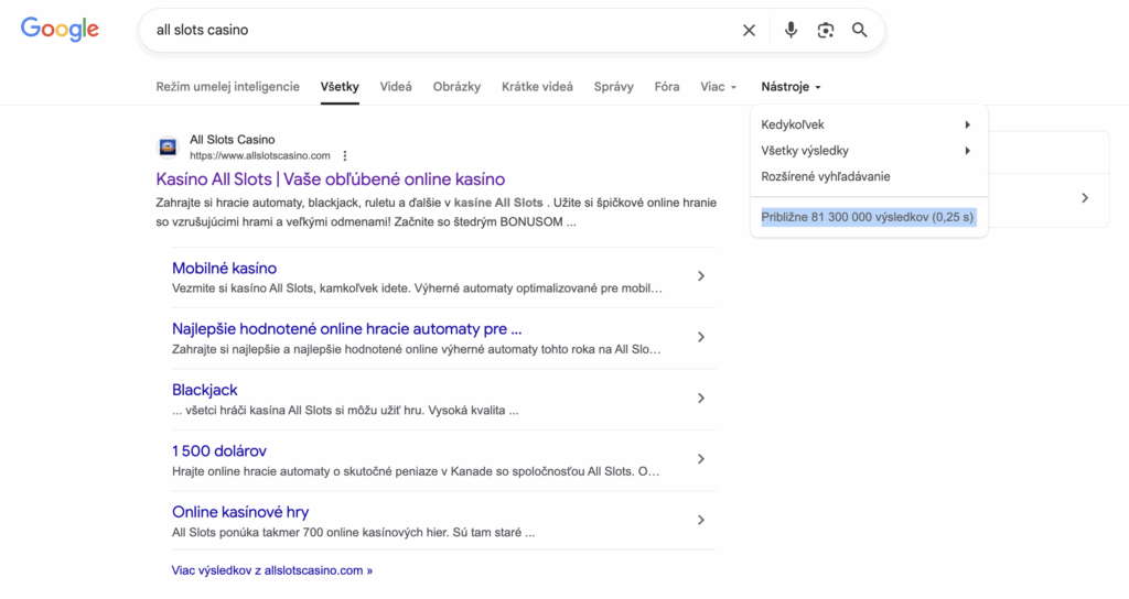 Na základe analýzy výsledkov vo vyhľadávači Google sme zistili približne 81 300 000 výsledkov so zmienkou o kasíne All Slots Casino. Ide o veľmi vysoké číslo, ktoré jasne naznačuje, že značka má silnú online prítomnosť a patrí medzi najviac diskutované kasína na internete. Takéto množstvo výsledkov potvrdzuje vysokú mieru dôveryhodnosti a dlhodobého pôsobenia na trhu.