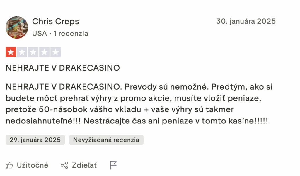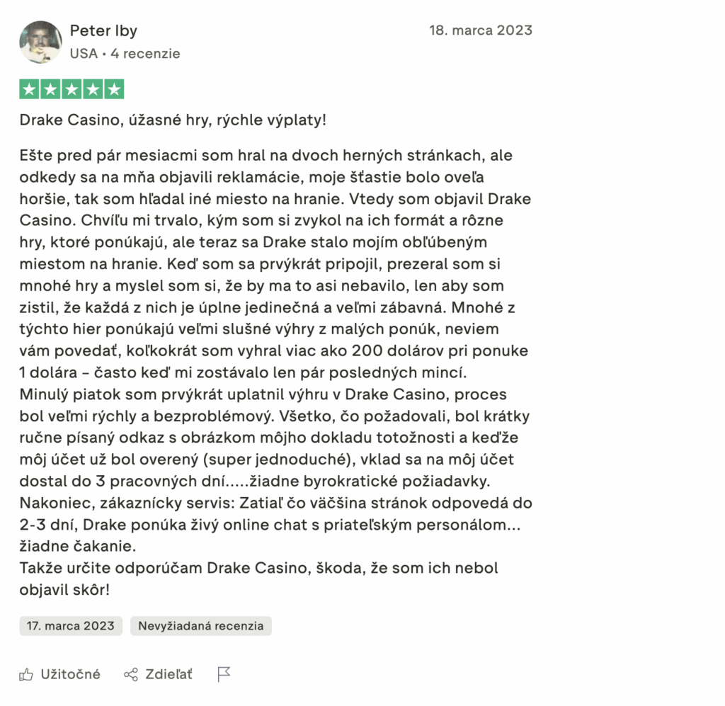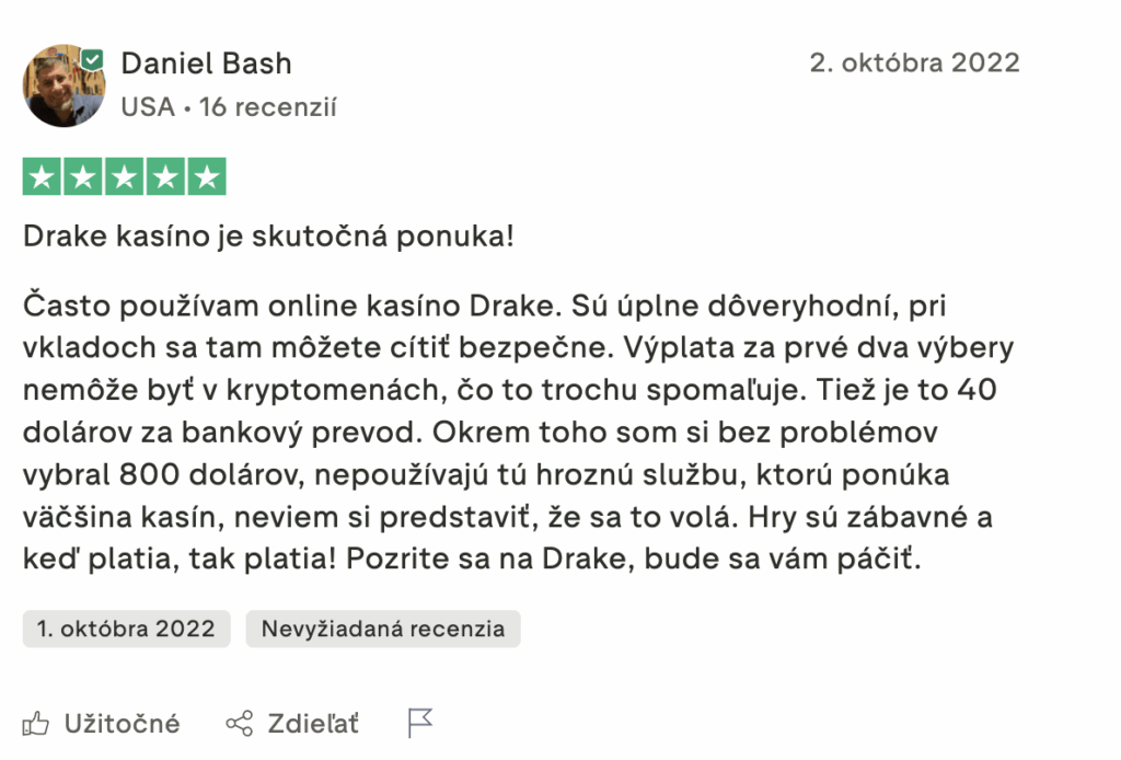 Používatelia pozitívneho a negatívneho hodnotenia Drake kasína?
