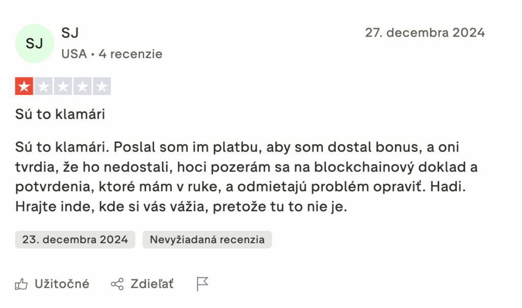 | Skúsenosti hráčov | Priemerné hodnotenie 5.6/10 (19 recenzií) | Zmiešané skúsenosti – niektorí hráči chvália rýchle výplaty, iní upozorňujú na nevyplatené výhry. |