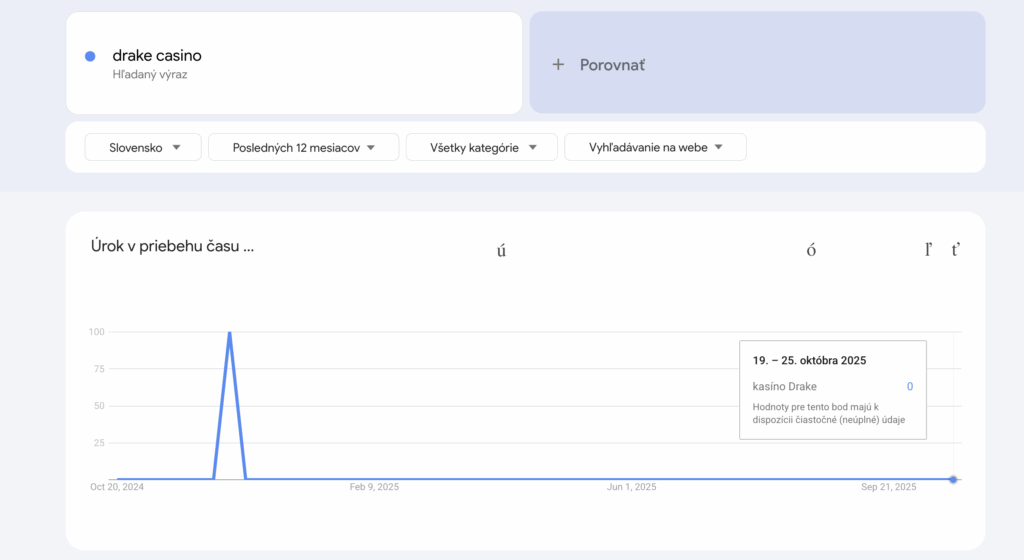 Na základe analýzy údajov z Google Trends pre výraz „Drake Casino“ za posledných 12 mesiacov na Slovensku sme zaznamenali iba jeden krátky nárast záujmu, po ktorom nasledoval dlhodobý pokles na nulovú úroveň. Z analytického pohľadu to znamená, že kasíno má minimálnu alebo takmer žiadnu trvalú vyhľadávanosť.