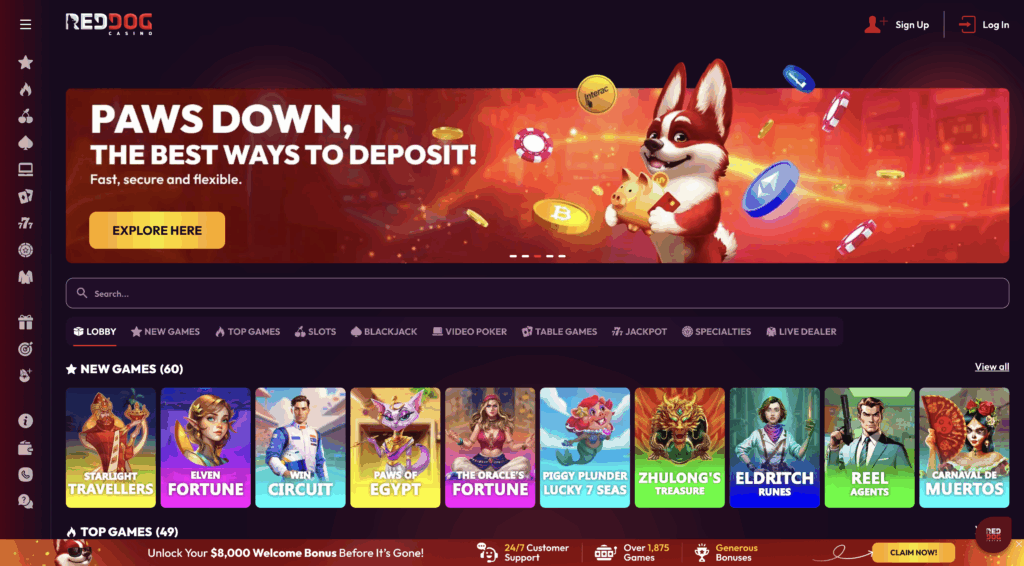 Webová stránka Red Dog Casino pôsobí moderne, farebne a výrazne herne orientovane. Už na prvý pohľad upúta pozornosť dynamickým bannerom s novou hrou a uvítacím bonusom, čo jasne komunikuje zameranie kasína na lákanie nových hráčov. Dizajn je prehľadný a intuitívny – hlavné menu sa nachádza na ľavej strane, čo umožňuje rýchly prístup k rôznym kategóriám hier ako automaty, blackjack, video poker, stolové hry, jackpoty či živé kasíno.
