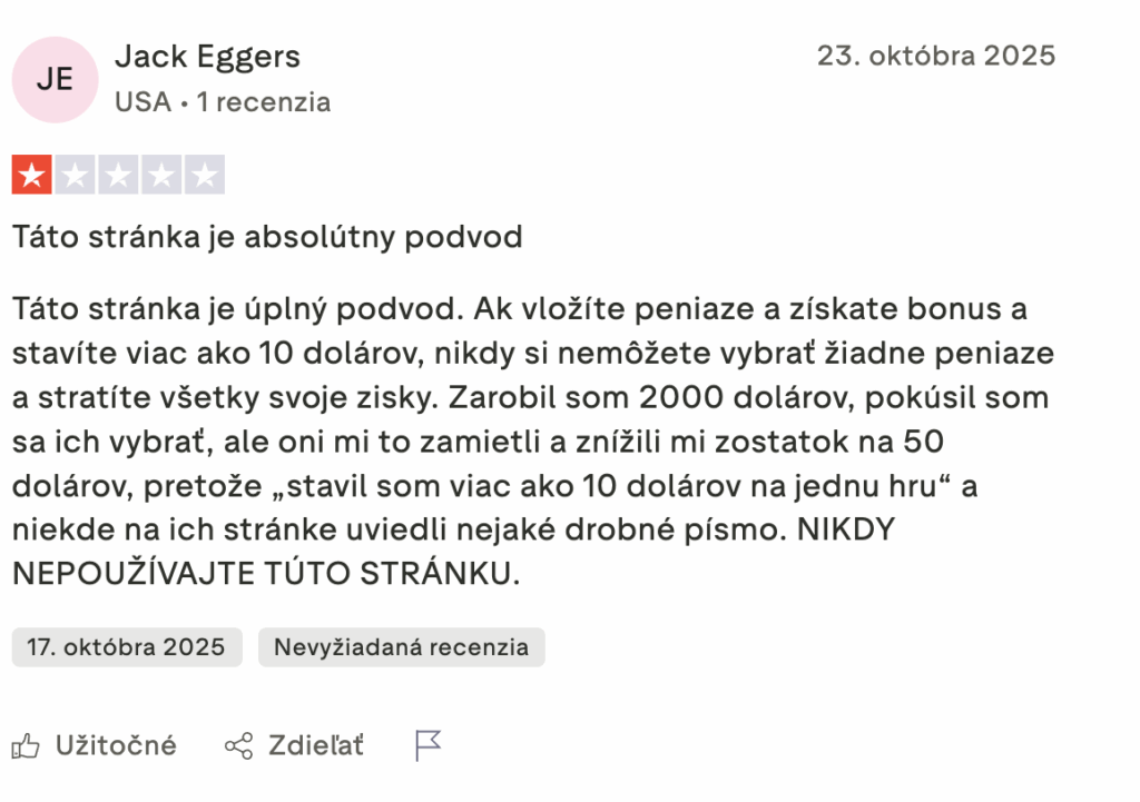 | Hodnotenie hráčov | 2/10 (1 recenzia) | Negatívna spätná väzba – oneskorené výplaty, slabý výber hier. |