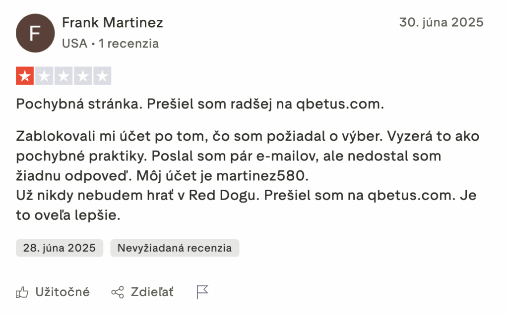 Ako potenciálny hráč by ste mali k Kasínu Red Dog pristupovať s veľkou opatrnosťou. Hoci chýbajú širšie recenzie a debaty, hlavný relevantný príspevok na Reddite (pred 2 mesiacmi) kritizuje kasíno za extrémne pomalé a nefunkčné výplaty. Konkrétne obvinenie o dvojtýždňovom uviaznutí 500 dolárov v stave čakania naznačuje závažné problémy s likviditou alebo zákazníckym servisom pri spracovaní výberov.
