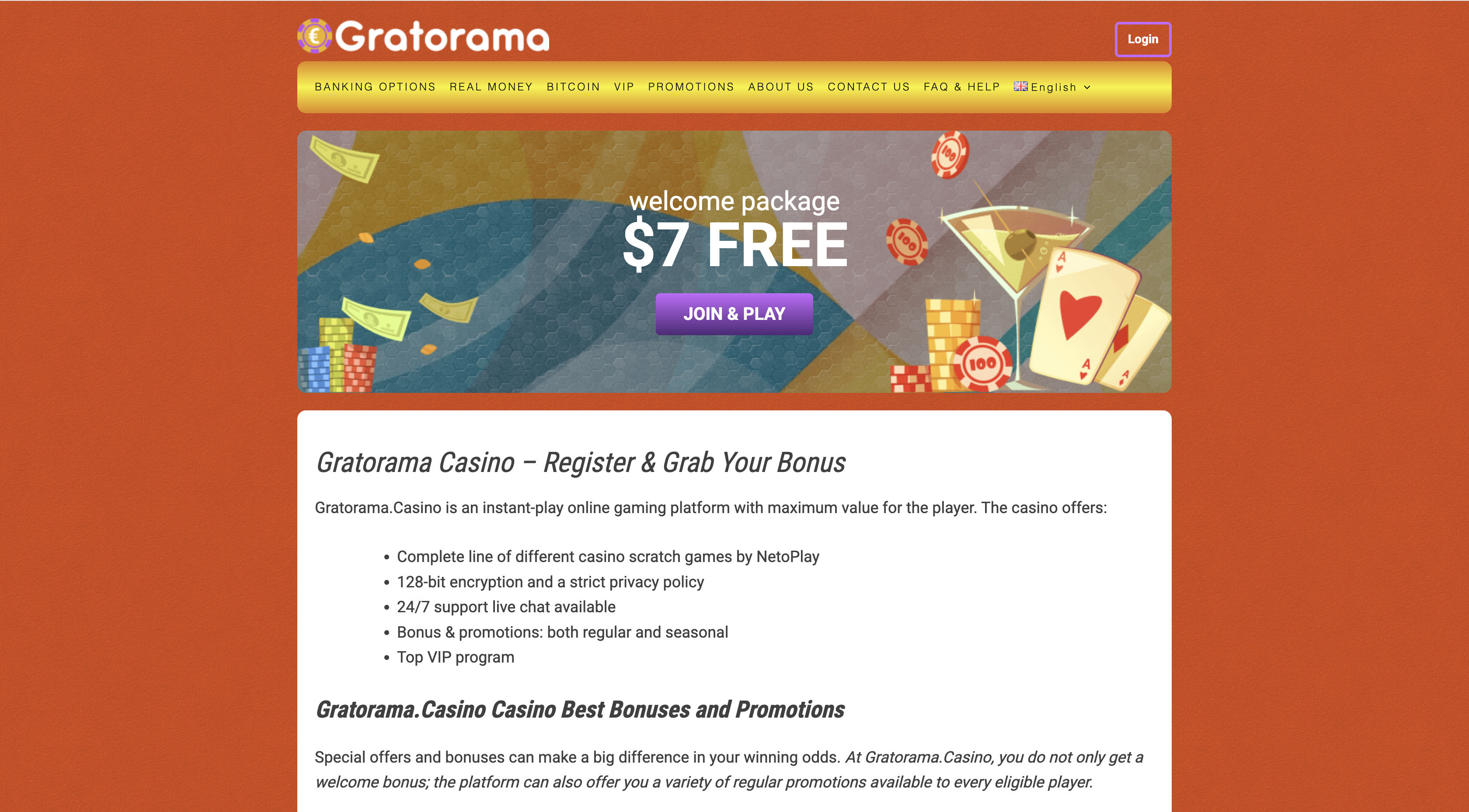 Webová stránka Gratorama Casino pôsobí jednoducho, no prehľadne a cielene smeruje na hráčov, ktorí preferujú rýchly prístup k bonusom a stieracím hrám. Úvodná sekcia láka používateľov na uvítací bonus 7 € zdarma, čo je výrazný motivačný prvok, hoci hodnota bonusu je relatívne nízka. Hneď pod hlavným bannerom sa nachádza textový blok s vysvetlením základných výhod platformy – bezpečnosť SSL, nonstop podpora a rôzne promo akcie. Tento prístup pôsobí dôveryhodne, no dizajn stránky je veľmi jednoduchý a skôr pripomína starší štýl kasín z rokov 2010-2015.