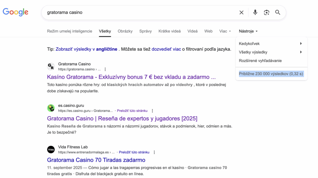 Na základe analýzy výsledkov vyhľadávania v Google bolo identifikovaných približne 230 000 stránok so zmienkou o kasíne Gratorama. Tento počet predstavuje stredne vysokú úroveň online viditeľnosti – značka je prítomná na viacerých portáloch a fórach, no stále má priestor na rozšírenie povedomia.