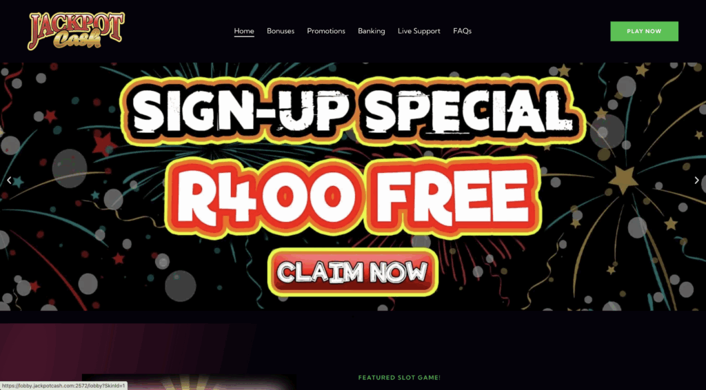 Web Jackpot Cash Casino pôsobí vizuálne atraktívne a farebne prepracovane, s jasným tematickým zameraním na sezónne promo akcie – v tomto prípade Halloween („Spooky Wins“). Hneď v úvode je dominantný banner s ponukou bonusu 100 % do R3 000 + 83 free spinov, ktorý okamžite pritiahne pozornosť. Dizajn je moderný, prehľadný a ladený do tmavých odtieňov so svetelnými efektmi, čo vytvára typickú atmosféru kasína. Hráč má okamžitý prístup k hlavným sekciám – Bonusy, Promócie, Bankovníctvo, Live Support a FAQ, čo zlepšuje používateľský komfort.