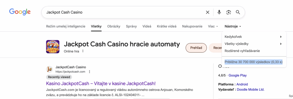 Na základe analýzy výsledkov vyhľadávania v Google sme zistili, že výraz „Jackpot Cash Casino“ sa objavuje v približne 30 700 000 výsledkoch. To je veľmi vysoké číslo, ktoré naznačuje, že o tomto kasíne sa na internete veľa píše a je pomerne známe v online priestore.