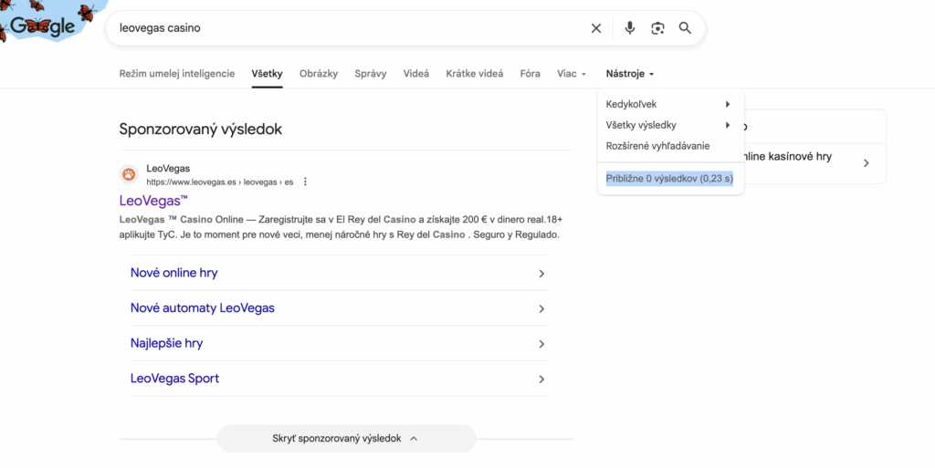 Na základe analýzy výsledkov vo vyhľadávači Google sa pre výraz LeoVegas Casino zobrazilo približne 0 výsledkov (0,23 s). To znamená, že o tejto značke sa v slovenskom online priestore momentálne prakticky nepíše. Z pohľadu analytika ide o veľmi nízku úroveň viditeľnosti, čo môže naznačovať buď slabú lokálnu propagáciu, alebo obmedzený záujem hráčov v tomto regióne.