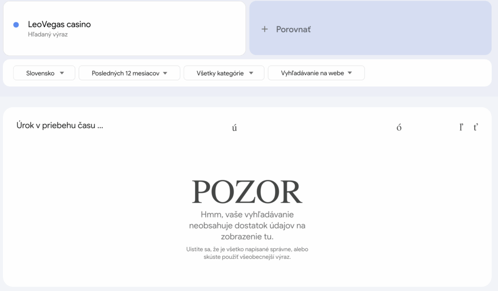 Na základe analýzy v Google Trends pre výraz LeoVegas casino sa ukázalo, že na Slovensku nie je k dispozícii dostatok dát na zobrazenie trendu vyhľadávania. To znamená, že hráči tento pojem vyhľadávajú len veľmi zriedkavo alebo vôbec. Z pohľadu analytika ide o nízku úroveň záujmu, čo poukazuje na minimálnu znalosť značky medzi slovenskými používateľmi.