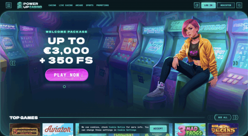 Webová stránka PowerUp Casino pôsobí veľmi moderne a dynamicky, s jasne futuristickým dizajnom a hernou atmosférou, ktorá okamžite zaujme. Hneď po vstupe hráča víta veľký banner s uvítacím bonusom až do 3 000 € a 350 free spinov, čo naznačuje, že kasíno sa sústreďuje na prilákanie nových hráčov silnými promo ponukami. Dominujú žiarivé neónové farby, sci-fi grafika a animované prvky, ktoré vytvárajú dojem rýchlosti a zábavy. Navigácia je intuitívna – tlačidlá „Play Now“ a „Get Bonus“ sú umiestnené strategicky a podporujú okamžitú akciu.