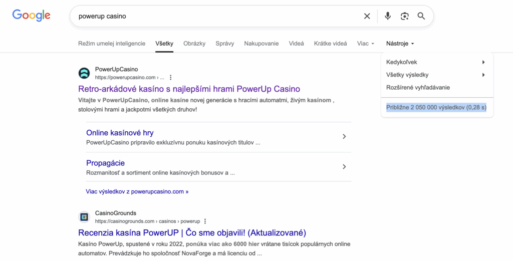 Na základe analýzy výsledkov vyhľadávania Google pre dopyt „PowerUp Casino“ sme zaznamenali približne 2 050 000 výsledkov (0,28 s). Ide o veľmi vysoký počet, ktorý naznačuje, že značka má silnú online prítomnosť a je často spomínaná v rôznych zdrojoch. Z analytického pohľadu je to pozitívny ukazovateľ dôveryhodnosti a viditeľnosti – čím viac sa o kasíne píše, tým väčší je záujem hráčov aj médií. Tento objem výsledkov potvrdzuje, že PowerUp Casino patrí medzi známejšie a rozpoznateľné mená na trhu online kasín.