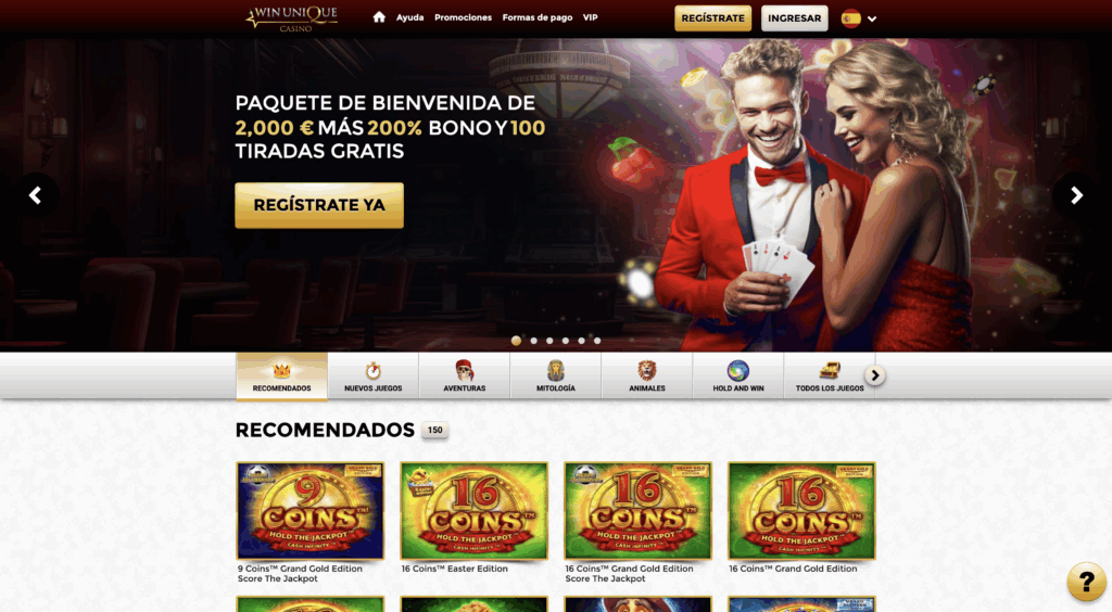 Webová stránka Win Unique Casino pôsobí na prvý pohľad veľmi atraktívne a vizuálne silno orientovaná na emócie a luxus. Hneď v úvode sa návštevník stretáva s veľkým bannerom, ktorý ponúka uvítací balíček až do 2 000 € a 200 % bonus s 100 free spinmi. Takýto prístup okamžite láka nových hráčov, pričom dizajn v červeno-zlatých tónoch vyvoláva dojem exkluzivity a prémiového zážitku. Tlačidlo „Regístrate ya“ je dobre umiestnené a jasne motivuje k akcii.