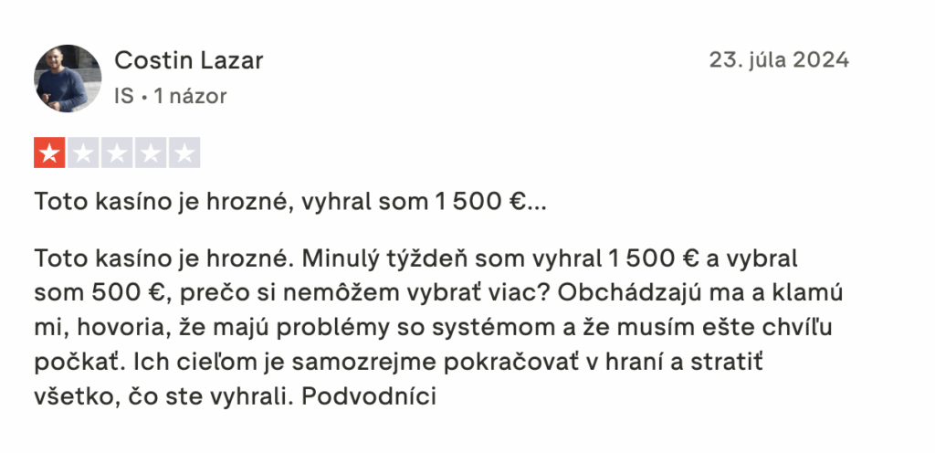 Na druhej strane sa v niektorých negatívnych hodnoteniach spomínajú oneskorené výplaty a obmedzenia pri výberoch, čo naznačuje, že kasíno môže mať slabiny v spracovaní transakcií. Niektorí hráči vyjadrili aj nespokojnosť s marketingovou komunikáciou.