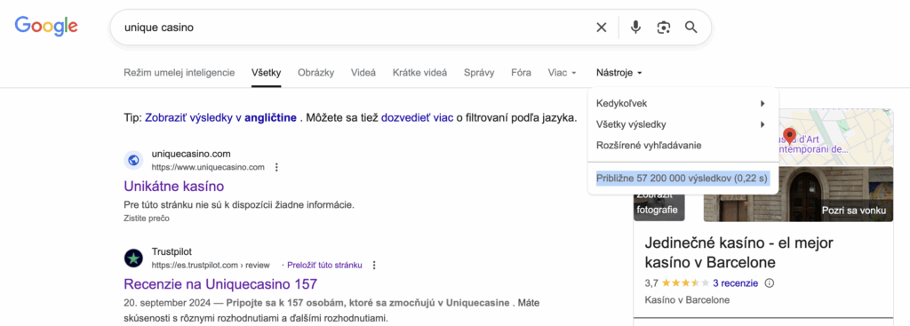Na základe analýzy výsledkov vyhľadávania v Google pre dopyt „unique casino“ sme zaznamenali približne 57 200 000 výsledkov (0,22 s). Takýto počet záznamov je nadpriemerne vysoký, čo naznačuje, že kasíno má výraznú online prítomnosť a je často spomínané v rôznych zdrojoch – od recenzií až po fóra a spravodajské články.