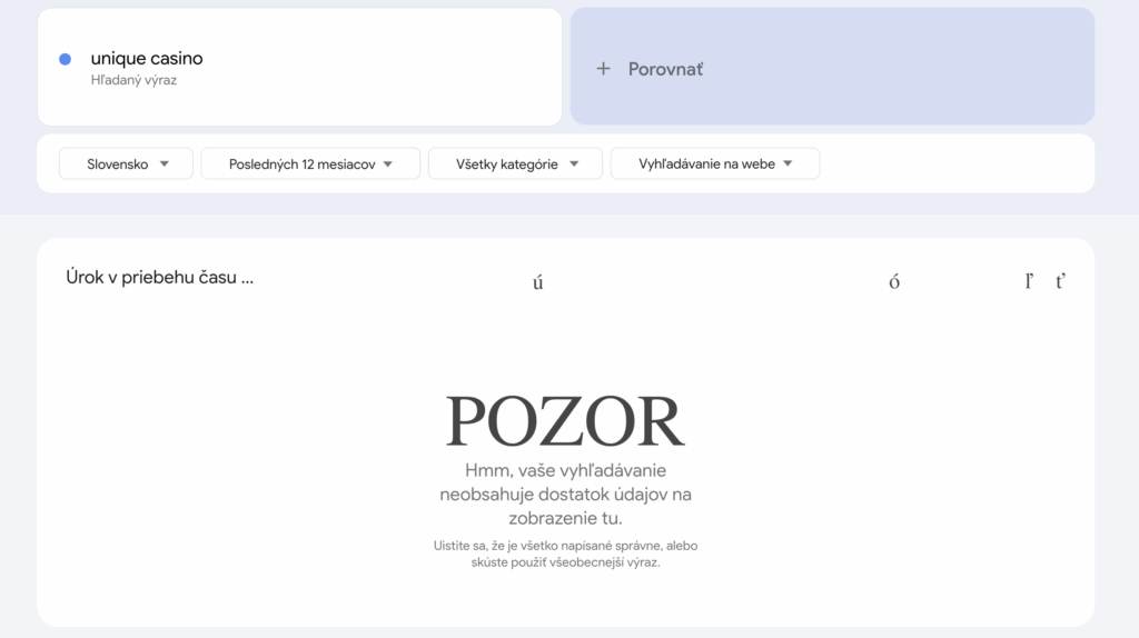 Na základe analýzy Google Trends pre výraz „unique casino“ za posledných 12 mesiacov na Slovensku sme zistili, že nie je k dispozícii dostatok dát na zobrazenie trendu vyhľadávania. To znamená, že o túto značku je v krajine minimálny alebo takmer nulový záujem.
