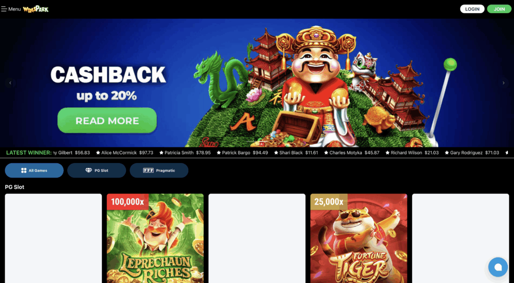 Webová stránka WinsPark Casino pôsobí vizuálne atraktívne a prehľadne, s moderným dizajnom a výraznými farbami, ktoré ihneď upútajú pozornosť. Hlavný banner s animovaným džinom a ponukou denného bonusu 10 % vytvára pozitívny prvý dojem a motivuje hráča kliknúť na tlačidlo „Read More“. Tento úvodný blok je jasne zameraný na propagáciu bonusov a okamžité zapojenie nových hráčov, čo je efektívny marketingový krok.