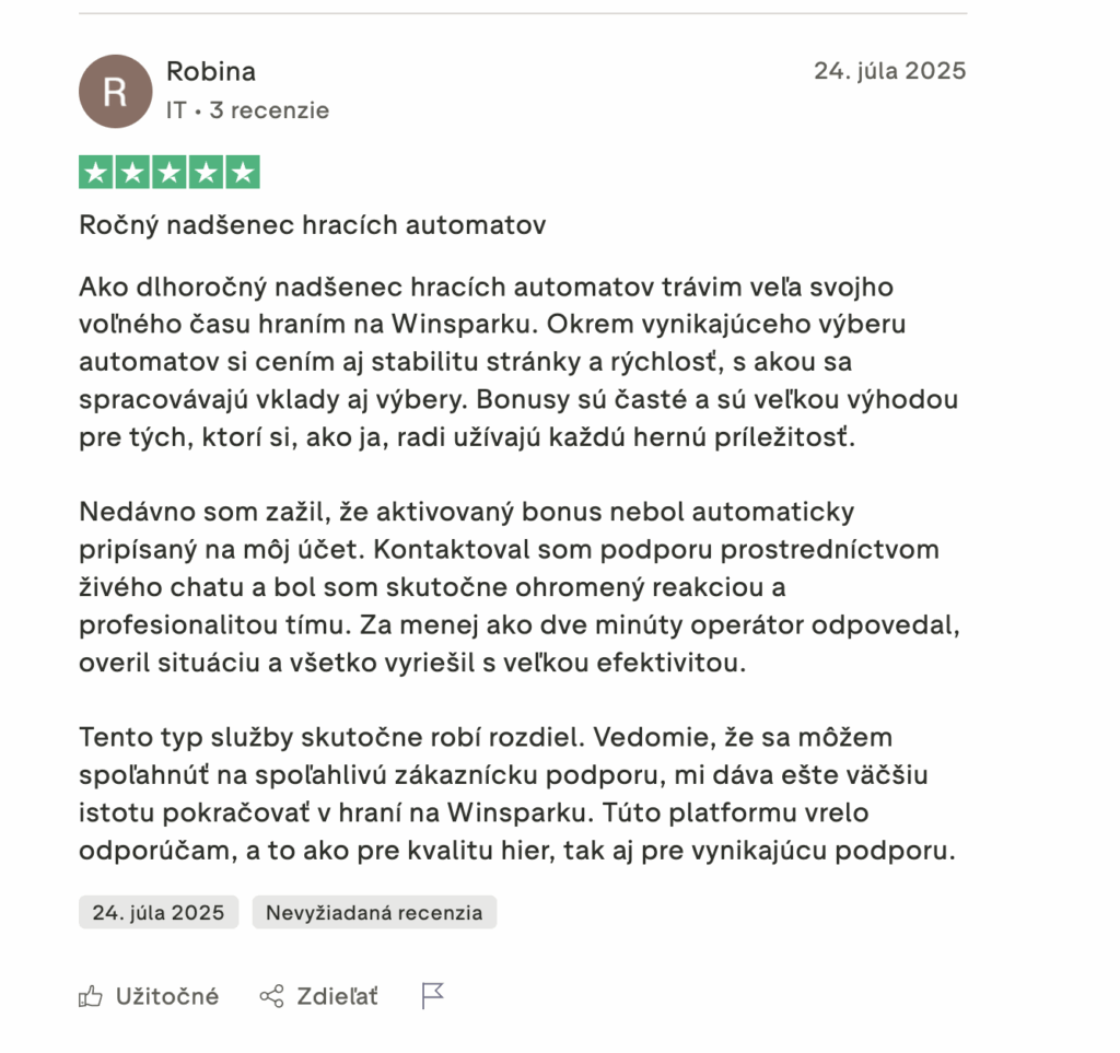 Z analytického hľadiska to znamená, že značka zatiaľ nemá silné povedomie na slovenskom trhu. Nie je to však nutne negatívne – ide skôr o priestor na rast. Ak by WinsPark Casino investovalo do lokálneho marketingu a propagácie, potenciál na zvýšenie viditeľnosti a dôvery medzi hráčmi je značný.