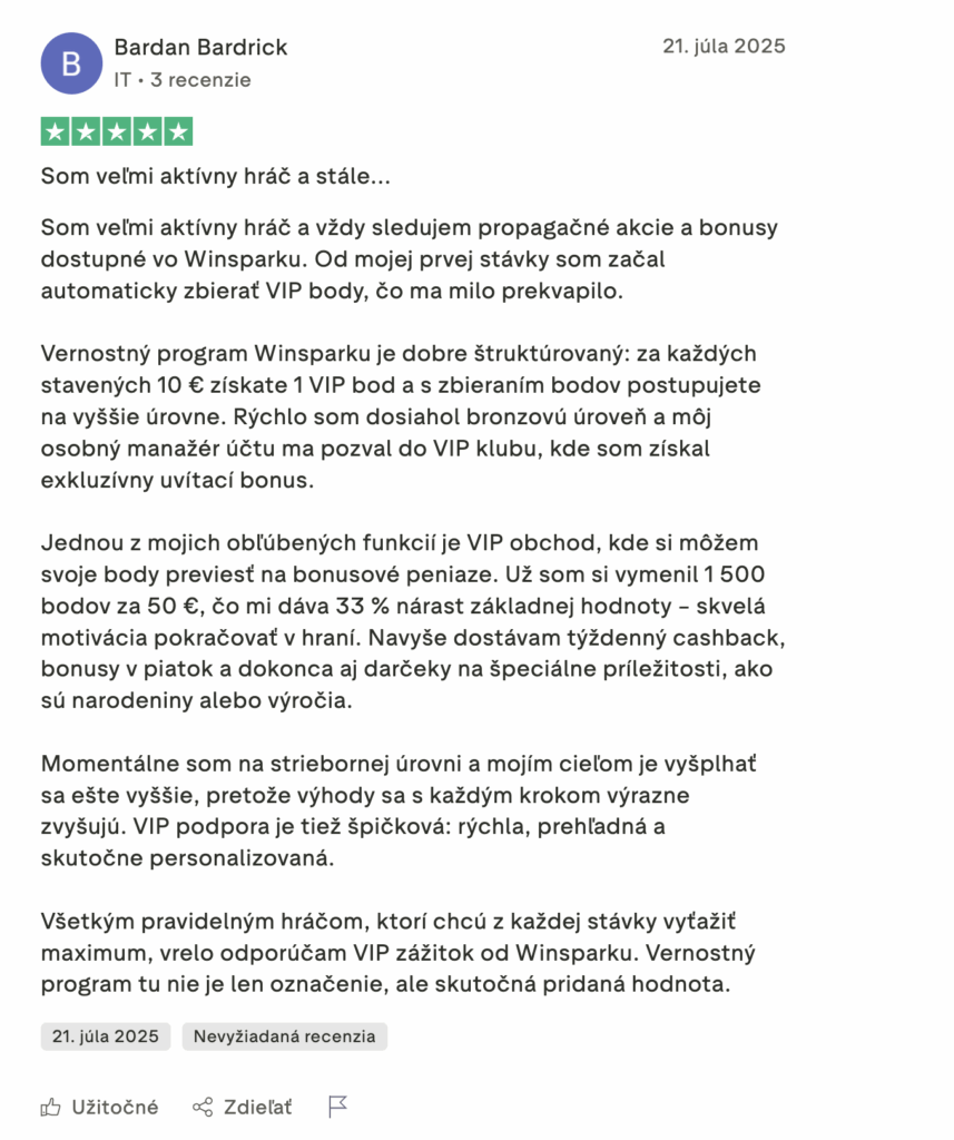 Na základe dostupných recenzií má WinsPark Casino zmiešanú reputáciu, avšak v posledných hodnoteniach prevažujú pozitívne skúsenosti. Viacerí hráči oceňujú širokú ponuku hier, rýchle spracovanie vkladov a výberov, ako aj kvalitnú zákaznícku podporu, ktorá reaguje promptne a profesionálne. Zvlášť vyzdvihovaný je VIP program s bonusmi a osobným prístupom, ktorý poskytuje hráčom motiváciu a pridanú hodnotu.