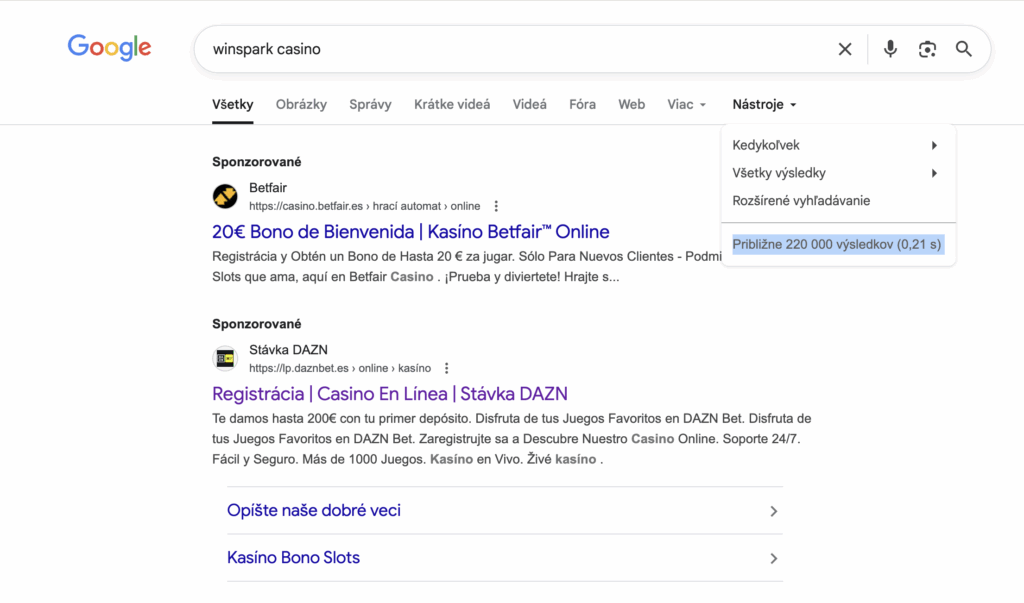 Na základe analýzy výsledkov vyhľadávania v Google pre výraz „WinsPark Casino“ bolo nájdených približne 220 000 výsledkov. Tento počet je pomerne vysoký, čo naznačuje, že značka má dobrú online prítomnosť a je aktívne spomínaná na viacerých portáloch a fórach.
